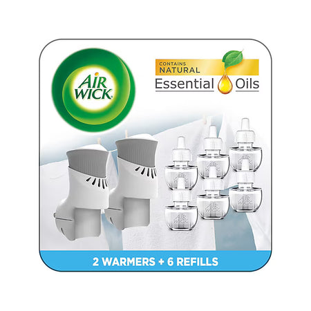 Enhance your space's scent with this Air Wick plug-in scented oil starter kit consisting of two warmers and six refills infused with 100% natural essential oils. Air Wick scented oil refills release continuous fragrance for up to 60 days (based on low setting) so your space smells welcoming. The Air Wick scented oil warmer optimizes airflow for 360-degree fragrance diffusion, reaching every corner of the room for a consistent fragrance experience. The warmer also allows you to choose between five fragrance settings for just the right amount of fragrance while continuously diffusing and carefully blending fragrance throughout your space.