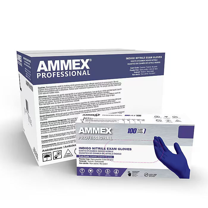 AMMEX Professional Indigo Exam Nitrile Gloves meet all safety and comfort standards. These durable, powder-free, latex-free, 3-mil gloves are popular across the healthcare spectrum from medical to dental, veterinarian to tattooing, child care to food service. AMMEX Professional Indigo exam nitrile gloves have you covered. High tactile sensitivity with strong barrier protection.