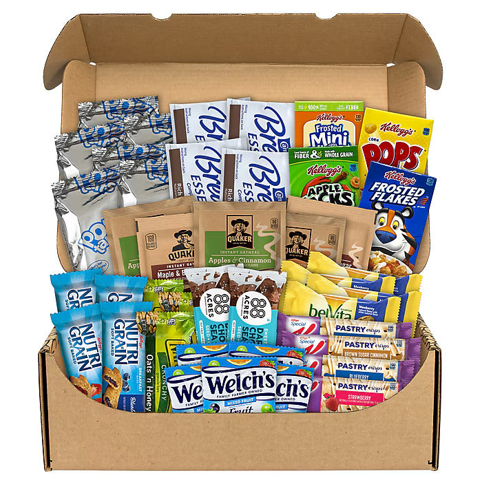 Waking up to this Breakfast Snacks Box every morning would be a great start to the day! With 6 Poptarts, 5 Quaker Oatmeal, 3 Nature Valley Granola Bar, 4 Carnation Instant Breakfast Pouches, 4 Kellogg Cereal Boxes, 4 Special K Pastry Crisps, 4 Belvita Cookies, 2 88 Acres Bars, 4 NutriGrain Bars, 5 Welch's Fruit Snacks, this snack assortment has a little bit of everything to go with your morning cup of coffee. Get a head start to the day at the office with this Breakfast Snacks Box, by stocking the breakroom or your own personal stash with these delicious breakfast snacks!