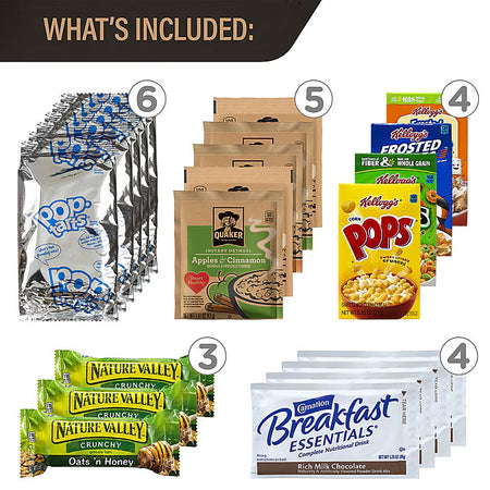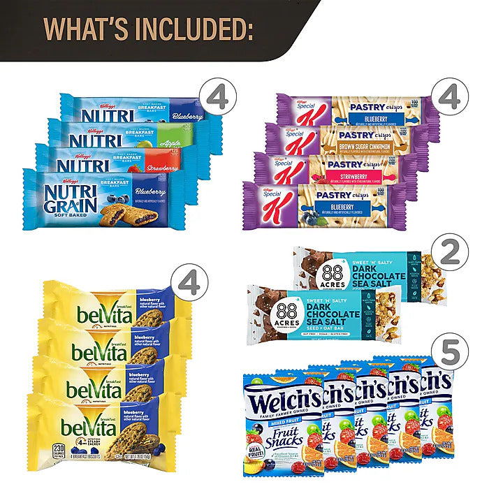 - Each box contains: six PopTarts Variety, five Quaker Oatmeal Flavor Variety, three Nature Valley Crunchy Granola Variety, four Carnation Breakfast Essentials, four Kellogg's Cereal Assortment, four Special K Pastry Crisps Blueberry, four Belvita Breakfast Biscuits Blueberry, two 88 Acres Dark Chocolate Sea Salt Bars, four Nutri Grain Breakfast Bars Assorted, five Welch's Mixed Fruits Snacks
