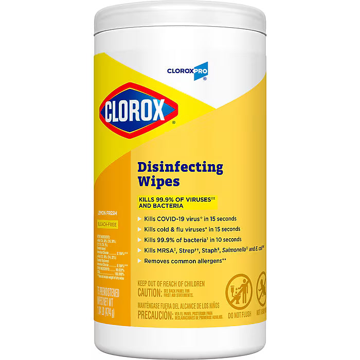 Clorox® Disinfecting Wipes clean and disinfect in one easy step. These sanitizing wipes are EPA-registered to kill 99.9% of germs including cold and flu viruses, E. coli, Salmonella, Staph, Strep, MRSA and the organism that can cause whooping cough. They also remove common allergens like pet dander, pollen particles and grass. One antibacterial wipe can kill bacteria in just 10 seconds, which is three times faster than before. In addition, these wipes meet EPA criteria for use against SARS-CoV-2, the virus that causes COVID-19, on non-porous surfaces The premoistened, thick, texture wipes are perfect for spills and dirt on a variety of hard, nonporous surfaces including acrylic, glass and vinyl. They quickly clean and disinfect high-touch germ hot spots such as doorknobs, handrails and faucets and are suitable for use on phones, keyboards and mouse. Ideal for offices, day care centers, schools, hotels, restaurants and other commercial facilities. Packaging may vary.