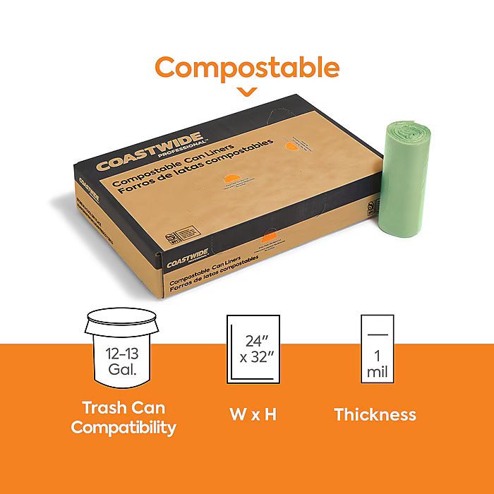 Coastwide Professional™ 12-13 Gallon Compostable Bag, 24" x 32", Low Density, 1 Mil, Green, 200 Bags/Box (CW62405)