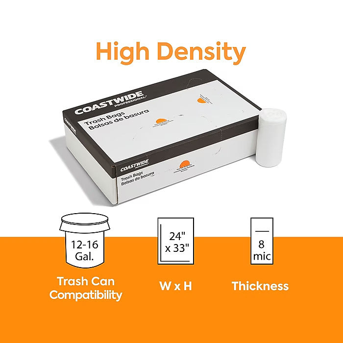 Coastwide Professional™ 12-16 Gallon Trash Bag, 24" x 33", High Density, 8 mic, Natural, 1000 Bags/Box