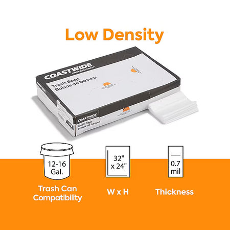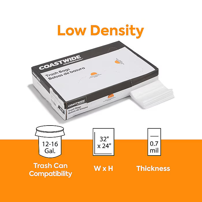 Coastwide Professional™ 12-16 Gallon Trash Bag, 32" x 24", Low Density, 0.7 mil, Clear, 250 Bags/Box