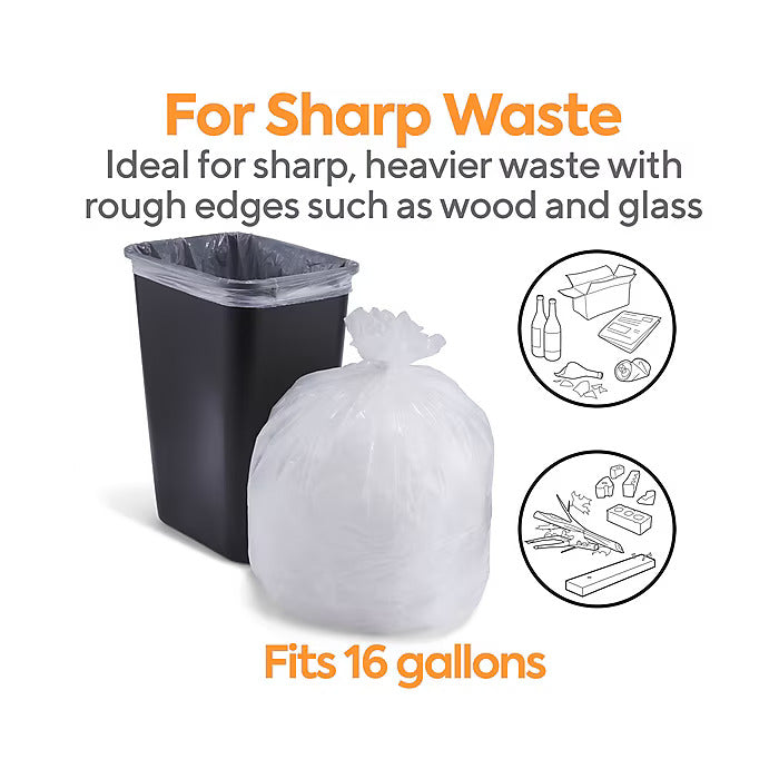 - The strong linear low-density polyethylene (LDPE) lining on these can liners allows for easy transport without tears or ribbing, while a clear white design makes these bags can liners easily identifiable for added convenience