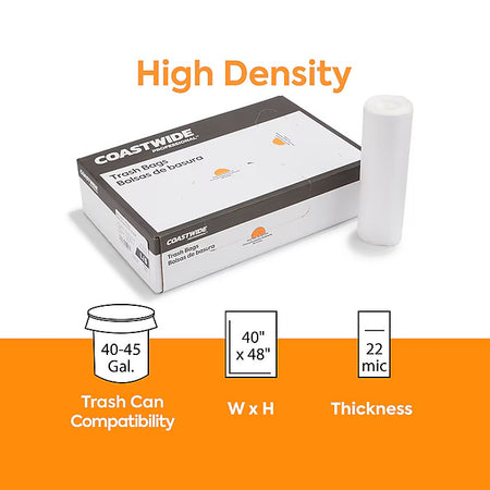 Coastwide Professional™ 40-45 Gallon Trash Bag, 40" x 48", High Density, 22 mic, Natural, 150 Bags/Box
