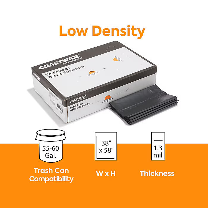 Coastwide Professional™ 55-60 Gallon Trash Bag, 38" x 58", Low Density, 1.3 mil, Black, 100 Bags/Box