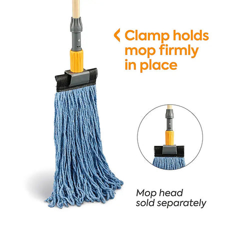 Use 5-inch headband mop heads on your office floors with this clamp-style mop handle. The wood handle delivers reliable performance, while the gray plastic head withstands harsh cleaning solutions, acids, and solvents. Clamp secures the headband mop in place. This Coastwide Professional clamp-style mop handle features orange wayfinding points for easy switching of mop heads.