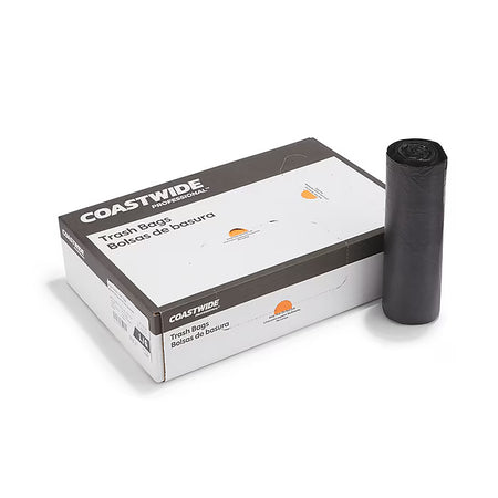 Enjoy convenient waste disposal with these trash bags. Low-density polyethylene offers strength to hold up to 55 gallons of refuse without tearing, making the bags perfect for areas that accumulate large amounts of garbage. The coreless rolls help save storage space, and perforated openings allow easy dispensing. These Coastwide Professional AccuFit trash bags are black to conceal the contents and give the workplace a clean appearance.