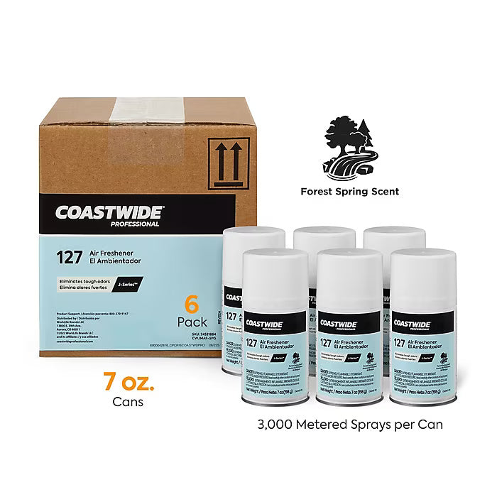 Cover up any unwanted odors with this aerosol air freshener. With more than 3000 metered releases, this air freshener can last for over 30 days and removes a variety of smells on contact while giving off a fresh scent. This Coastwide Professional™ metered air freshener refill has a dry formula mist, eliminating messy fallout on floors, counters, walls, and other surfaces. The Coastwide Professional™ metered air dispenser refill contains a safe and powerful system designed to digest organic wastes and eliminate malodor. This refill has low VOC content that meets the CARB limit.