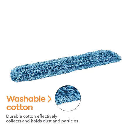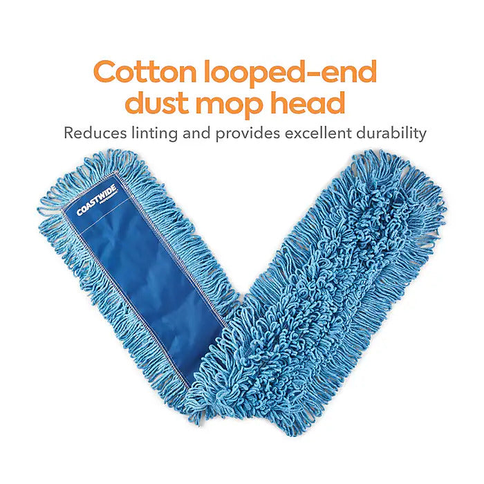 Cover large areas of flooring quickly with this blue dust mop head. The looped ends pick up fine particles, and the cotton construction offers added absorbency for a variety of cleaning tasks. A nonabsorbent polyester backing dries fast and resists mildew for added hygiene. This Coastwide Professional looped-end cotton dust mop head works with Coastwide Professional dust mop handles and frames for hassle-free setup.