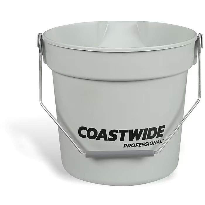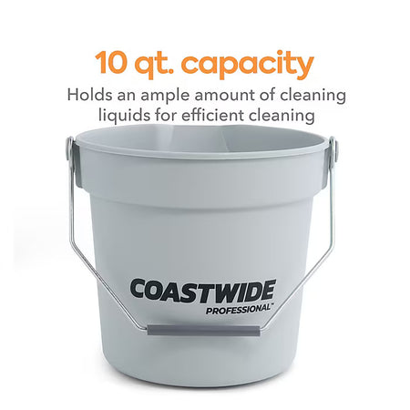 Clean large spaces easily with this gray plastic utility bucket. The plastic construction resists acids, bases, and solvents for lasting durability, while the 10-quart capacity holds an ample amount of cleaning liquids for efficient mopping. Featuring a molded-in spout, this Coastwide Professional gray plastic mop bucket pours liquids without spilling, and the graduated markings support accurate measurement of chemical cleaners and water.