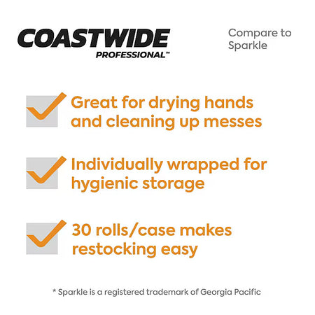 Manage the cleaning and dining needs of your workplace kitchen or bathroom with these durable Coastwide Professional paper towels. Each one has a classic white color to clearly indicate fully clean counters and comes in a two-ply thickness for superior absorbency. Each roll of towels is individually wrapped for safe storage and sheets are perforated for convenient dispensing so you can keep a roll on hand to offer easy hand-drying anywhere it's needed.