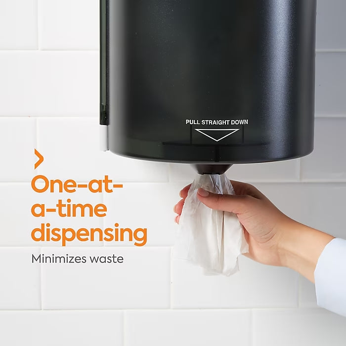 Wipe down surfaces or dry your hands with these Coastwide Professional™ paper towels that are compatible with most universal centerpull towel dispensers. These rolls contain 600 perforated sheets that are two-ply for strength and embossed for extra absorbency, and they are Green Seal certified thanks to their 100 percent recycled material construction. These Coastwide Professional™ paper towel rolls are ideal for keeping in restrooms, near kitchen areas or anywhere easily accessible paper towels might be needed.