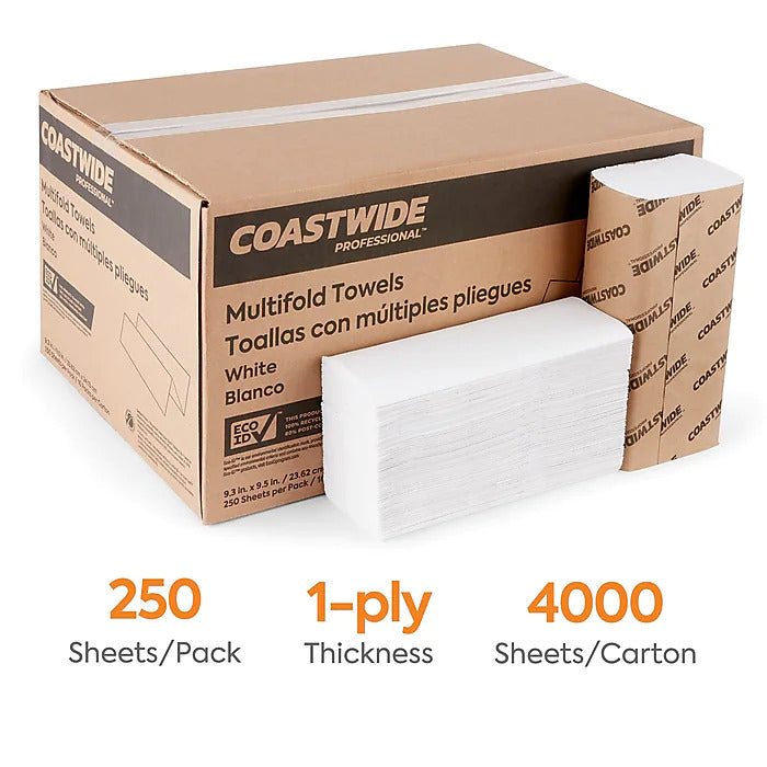 Coastwide Professional™ Recycled Multifold Paper Towels, 1-ply, 250 Sheets/Pack, 16 Packs/Carton (CW25384)