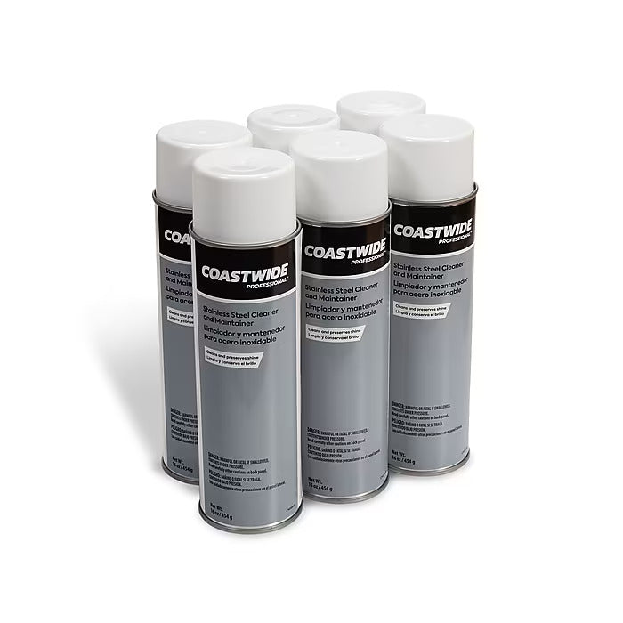 Maintain the sleek polish of stainless-steel surfaces with this 6-can carton of Coastwide Professional handheld stainless steel cleaner and maintainer.