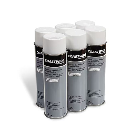 Maintain the sleek polish of stainless steel surfaces with this 6-can carton of Coastwide Professional handheld stainless steel cleaner and maintainer.