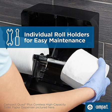 The Compact Quad® Plus Toilet Paper Dispenser was designed for maximum waste reduction, ease of maintenance, and hygiene. It is a coreless toilet paper dispensing system that holds up to 6,000 2-ply or 12,000 1-ply sheets. The Compact Quad (R)Plus Dispenser features a patented roll lock mechanism to help ensure maintainers do not replace rolls prematurely or have to fumble with sleds. When combined with the roll lock mechanism, our coreless toilet paper rolls enable nearly 100% paper usage. When the dispenser is opened, the empty roll holders automatically drop down, allowing for the efficient replacement of rolls that are completely empty. Additionally, the push functionality of the lock makes it easy to access and use the dispenser key.GP PRO is a division of Georgia-Pacific Consumer Products. We deliver well-designed, durable and easy-to-maintain professional solutions to meet the handwashing and cleaning needs for a range of business applications.