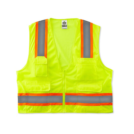 Ergodyne® GloWear® 8248Z Small/medium lime class 2 Hi-vis two-tone surveyor's vest with 2" reflective tape is made of 3.6 oz poly solid front and 3.3 oz mesh back for longer life. Vest with zipper closure includes 2 inside and 4 outside pockets.