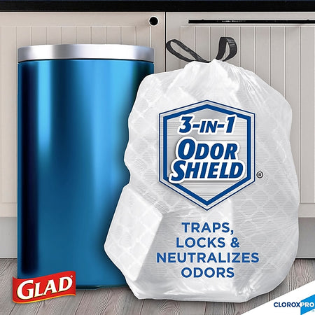 - 13 GALLON PLASTIC TRASH BAGS: Avoid messy kitchen or breakroom disasters with Glad Tall Kitchen CloroxPro Drawstring Trash bags, designed with stretchable strength to handle the heaviest loads without tearing