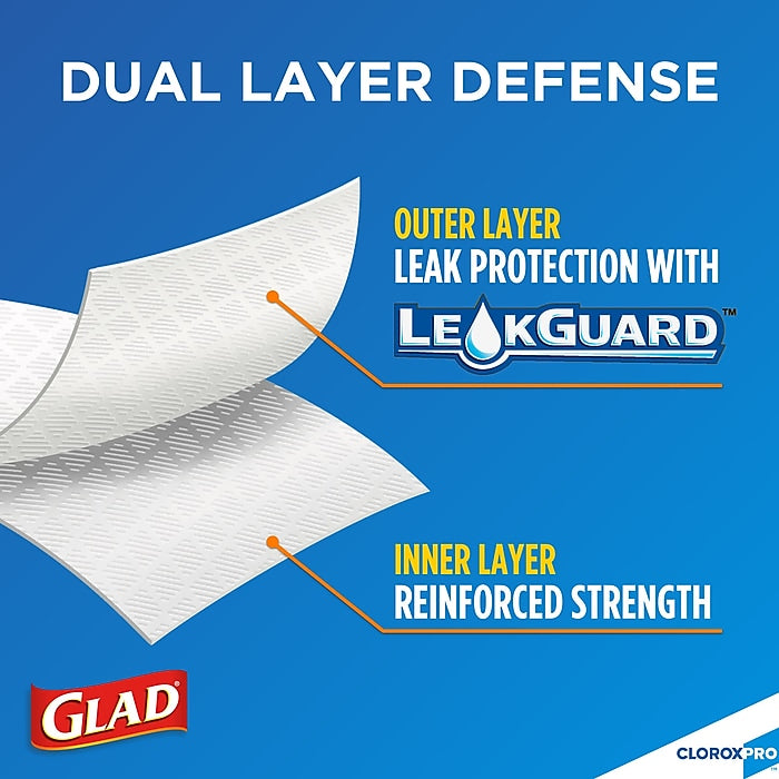 Keep your trash contained with the durability and quality of Glad CloroxPro. Glad Tall Kitchen Drawstring Trash bags are designed with ForceFlex technology to give extra flex as it expands around sharp edges and heavy loads, so you can pack it in without ripping. These dual-layered trash bags feature RipGuard and LeakGuard technology to resist punctures, rips and tears, and the seepage of liquids. Let the stretchable strength of Glad handle all the messes our busy daily life can throw at it and then some. The durable Grips-The-Can Drawstring ensures that the bag stays in place, and provides a sturdy 3-ply handle making it easy to lift, carry, and toss the bag. Tough and resilient, Glad can handle some abuse, so shake the trash deeper into the bag while keeping everything contained. The 13 gallon size is perfect for the kitchen or throughout the office and is great for your seasonal cleaning needs like Spring Cleaning and Back to School. CloroxPro, where clean means everything. Packaging may vary.
