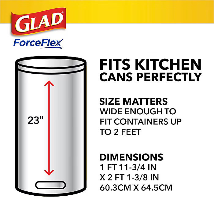 - FORCEFLEX STRENGTH: Glad’s trusted ForceFlex technology allows the bag to stretch and expand over heavy loads with sharp edges, delivering durable strength; packaging may vary