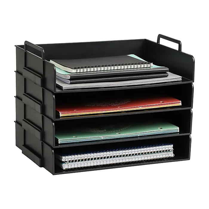 Optimize your workspace with this four-tier, stackable desktop organizer. Specifically designed to accommodate letter-size papers, folders, and files, this organizer allows you to keep your important documents within easy reach. The four separate organizers can be stacked together or placed in different areas of your desk, offering flexible storage solutions. This organizer isn't just limited to paperwork - it can also hold other office essentials like pencils, scissors, and rulers, helping keep your work area tidy. Beyond the office, it can be utilized in the kitchen or other spaces at home, providing a practical storage solution wherever it's needed. The sturdy plastic design is built to withstand daily use, and its neutral color ensures it blends seamlessly into any environment. As a practical and stylish organizer, it makes a great gift for coworkers, graduates, new homeowners, or anyone looking to declutter their workspace.