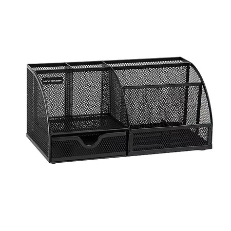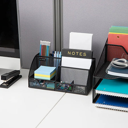 Get organized and boost productivity with this sleek and functional desktop organizer. The black metal mesh design adds a touch of style to your workspace while keeping all your supplies and accessories in order. With a minimalist design and seven compartments, this organizer is perfect for reducing desktop clutter, so you can spend more time working. Save space on your desk with this compact organizer that fits on nearly any desk without taking up too much valuable room. The organizer includes a mail sorter, sticky note pad holder, pen and pencil basket, and a paperclip drawer, all designed to keep your important supplies within easy reach, so time is not wasted locating these items. This durable desktop organizer is built to last, made from sturdy metal that is built to withstand the wear and tear of everyday use.