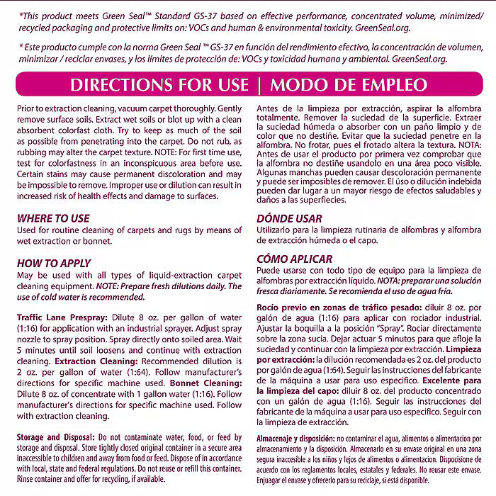 - How to Use: Use as directed on label. As a traffic lane prespray, dilute 8 ounces of the concentrate per gallon of water when applying with industrial sprayer; spray directly on soiled area and wait 5 minutes, then continue with extraction cleaning.