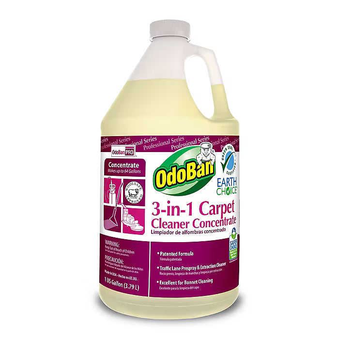 OdoBan's Professional Series 3-in-1 Carpet Cleaner Concentrate is a versatile and reliable product for your business or any area with high volume foot traffic. The 3-in-1 formula is meant to focus on areas of carpeting with the most traffic to help lift soils and bring carpet back to life, but it can also be used as a spot cleaner where needed and as an extraction cleaner. Prepare a fresh solution of the concentrate each day with cold water for maximum effectiveness. This one gallon jug of concentrate allows up to 64 gallons of cleaning solution, so rest assured your office area or living space will be covered if you have a large space or want to stock up. Use an industrial sprayer for maximum effectiveness. Make Life Fresh with OdoBan.
