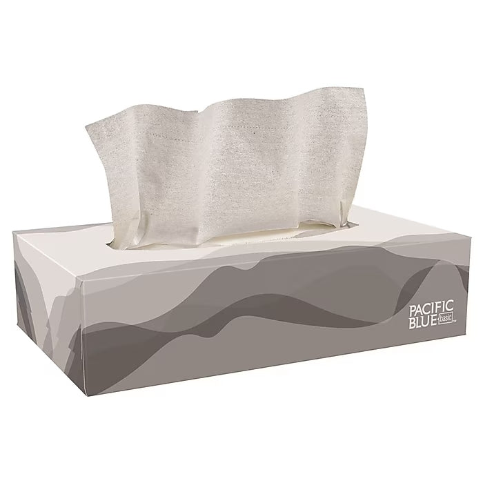 Pacific Blue Basic 2-ply facial tissues are soft, gentle and hypoallergenic, making them ideal for sensitive skin and use with runny noses due to allergies. Their smooth surface protects against chafing and irritation, even with extended use. Although lightweight, these 2-ply tissues are durable and absorbent enough to handle a variety of everyday messes. Made of 100% recycled material and contained in a fully recyclable cardboard box, these tissues are environmentally friendly. This highly economical pack of 30 boxes saves you money, giving you more tissues at a lesser cost.