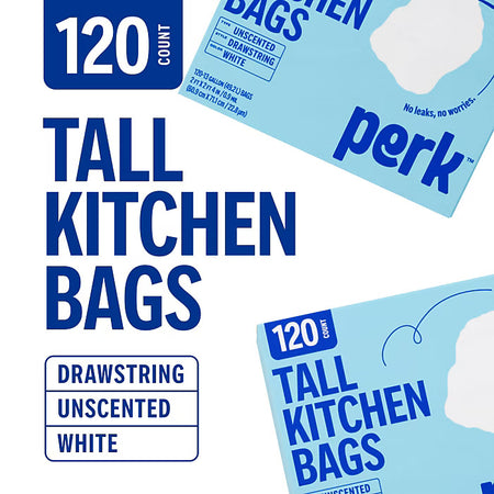 Take on the task of taking out the trash with these tall kitchen trash bags. With 120 strapping new bags in every box, these waste removers are ready to rumble with your breakroom crowd. The ample 13-gallon size is ready to guzzle all of your garbage, while the drawstring top makes it a cinch to lift and carry it all away in these Perk™ 13-gallon white drawstring trash bags.