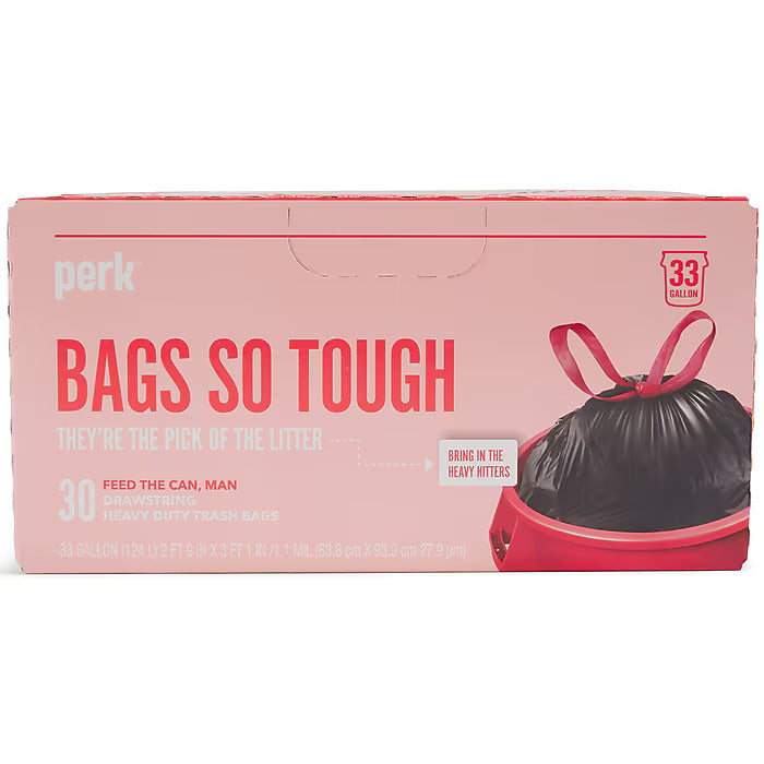 Take a load off and out with the convenient drawstring handles on these trash bags that keep your hands clean and your heart happy. Boasting 30 ways to leave the evidence of lunch under wraps, these hefty bags are ideal for indoor and outdoor jobs. These Perk™ 33-gallon heavy-duty trash bags are easy to fill, seal and deliver to the dumpster.