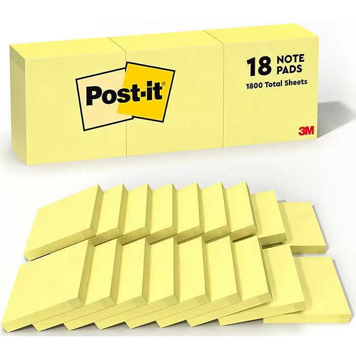 Post-it Notes, 3" x 3", Canary Collection, 100 Sheet/Pad, 18 Pads/Pack