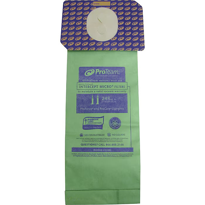 Assist your vacuum cleaner suction off spores, pollens and other microscopic particles efficiently with the "ProTeam 103483 Intercept Micro Vacuum Filter, 3.25 qt." This disposable vacuum filter is treated with antimicrobial organic agents and has a double-pleated design that increases the filtration area by 21%. Its thick disposable material makes these vacuum filters difficult to shred. These filters are compatible with PreForce Vac. The pack contains 10 micro filter bags. organic agents and feature a double-pleated design that increases the filtration area by 21%, enabling thorough cleaning. It has 10 bags per pack and is compatible with the PreForce Vac.