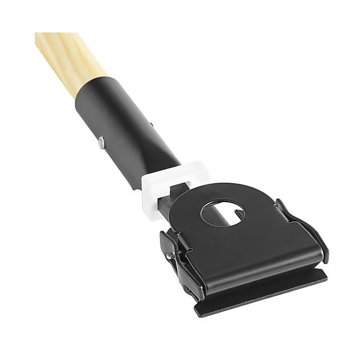 This wood dust mop handle is an ideal addition to any busy establishment thanks to its durability and ease of use. Its spring-loaded clip easily attaches to Rubbermaid snap-on dust mop frames. A sliding collar can either lock the handle into position or swivel 360 degrees for maximum mobility.