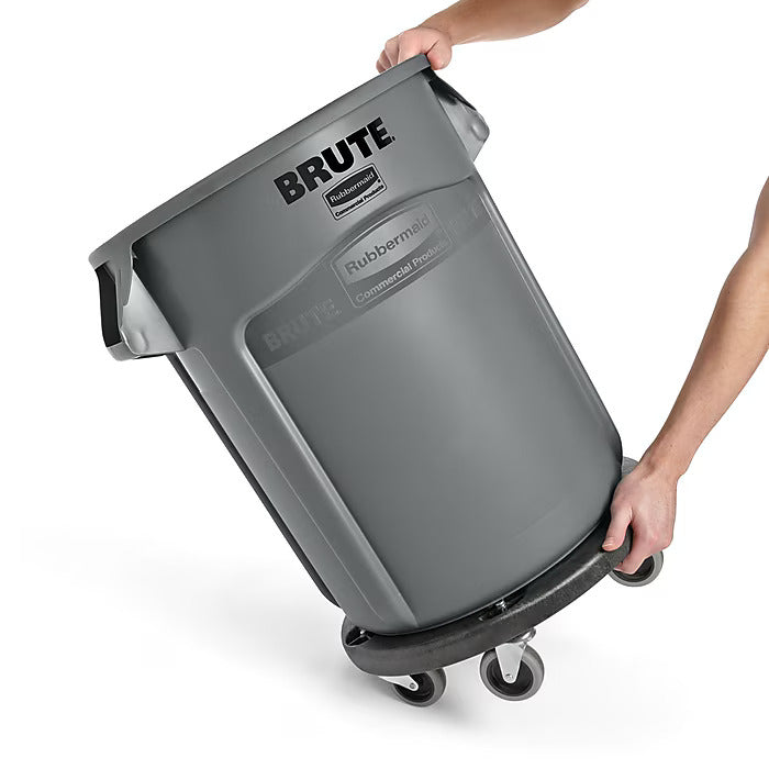 The Rubbermaid Commercial BRUTE® Dolly smoothly and efficiently transports 20 gallon, 32 gallon, 44 gallon, and 55 gallon BRUTE® trash containers easily and quickly. Provides easy mobility and maneuverability when collecting and transporting heavy loads. The dolly supports up to 250 lbs. and features an innovative twist-lock design to keep containers secure.