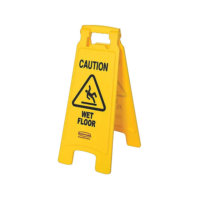 The Rubbermaid Commercial “Caution Wet Floor” Sign is a lightweight sign to help prevent customers, employees, and pedestrians from slips and falls. The sign folds to allow for convenient storage and transport on Janitorial Carts or Rim Caddies. The easy set up system is ideal for all floors, doorways, and narrow hallways in high traffic commercial, professional, and residential areas