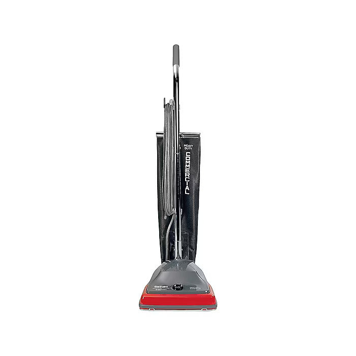 Bring professional cleaning capabilities to your office with this upright vacuum. The 12-inch cleaning path covers large areas in a single pass for fast results, and the reusable large-capacity shake-out bag holds up to 18 quarts of dust and dirt before needing to be emptied. This vacuum comes equipped with a long-life motor for powerful operation and enduring quality. A polycarbonate motor hood protects the interior components and stands up to frequent use for added durability. The True Balance Brushroll ensures quiet operation for use throughout the workday, so your janitorial staff can touch up carpets without disturbing visitors and office staff. Enjoy greater freedom of movement as you clean with the 30-foot cord, and use the integrated wrap to prevent tangles in between uses. With lightweight construction and an angled handle, this Sanitaire commercial vacuum allows for effortless navigation around furniture and long hallways.