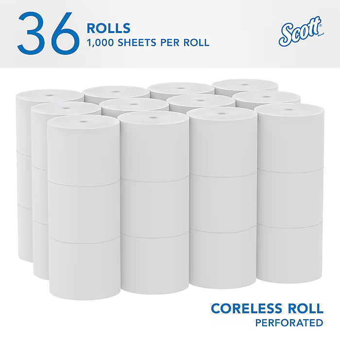 - 1,000 Sheets/Roll, 36 Scott® Essential Coreless High-Capacity Standard Roll Toilet Paper Rolls/Case; 36,000 Sheets/Case; 2-Ply; White