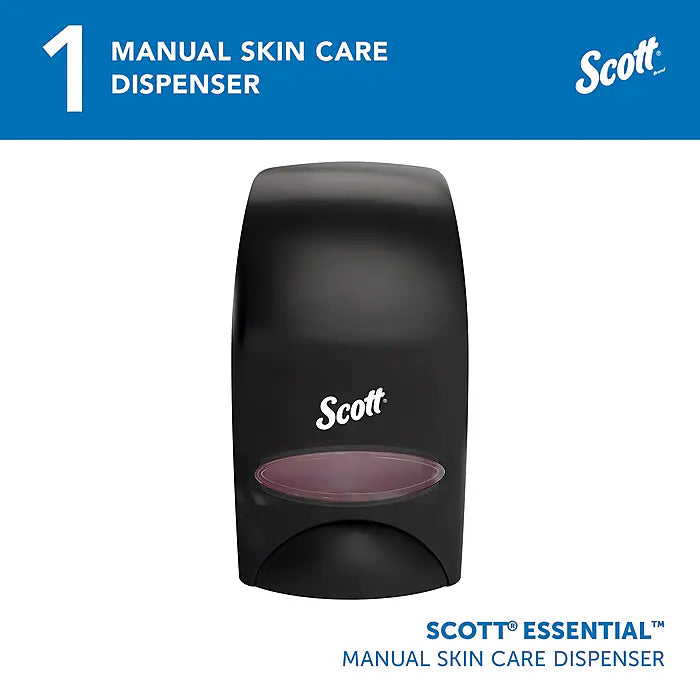 - 1 Scott® Essential™ High Capacity Manual Skin Care Dispenser/Case; Black; 1.0 L capacity; 4.85" x 8.36" x 5.43"