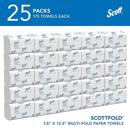 - 175 Sheets/Pack, 25 Scott® Pro™ Scottfold™ Multifold Paper Towel Packs/Case; 4,375 Sheets/Case; with Absorbency Pockets™; 7.8" x 12.4" sheets; White; fits universal dispensers with required adaptor