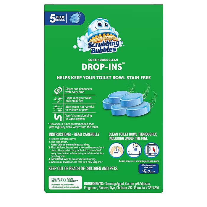 Scrubby has just the remedy for yucky toilet stains. Introducing Scrubbing Bubbles Drop-Ins toilet cleaning tablets. Just drop a tablet into your tank to help keep your toilet bowl stain-free up to four weeks. With every flush, your toilet enjoys glorious relief from stains caused by hard water, minerals, and limescale. That's continuous stain protection for a continuous clean. Quick and hassle-free.