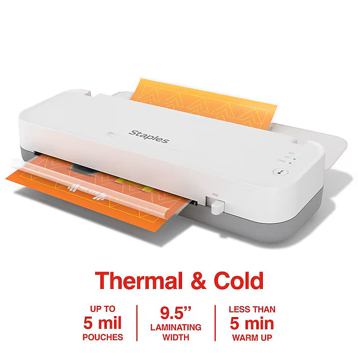 Staples Thermal & Cold laminating machine offers hot- & cold-type lamination to handle any laminating project. With a 3-5-minute warm-up and 15.7 in-per-minute speed you’ll knock out tasks quickly. Overall dimensions of 3.1" H x 14.84" W x 5.35" D allow flexibility in placement, and reverse jam prevention helps you back out of binds as soon as a mistake happens. A full 9" throat width allows you to laminate most documents, while the dual rollers give even pressure to make sure the laminate sticks picture-perfectly.
