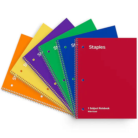 Stock your paper supplies cupboard with these assorted-color 1-subject notebooks. A spiral-bound design makes it easy to turn the pages, while the wide ruling ensures notes are large and easy to read. With six notebooks in the pack, these Staples 8 x 10.5-inch assorted-color 1-subject notebooks ensure you have paper on hand when you need it.