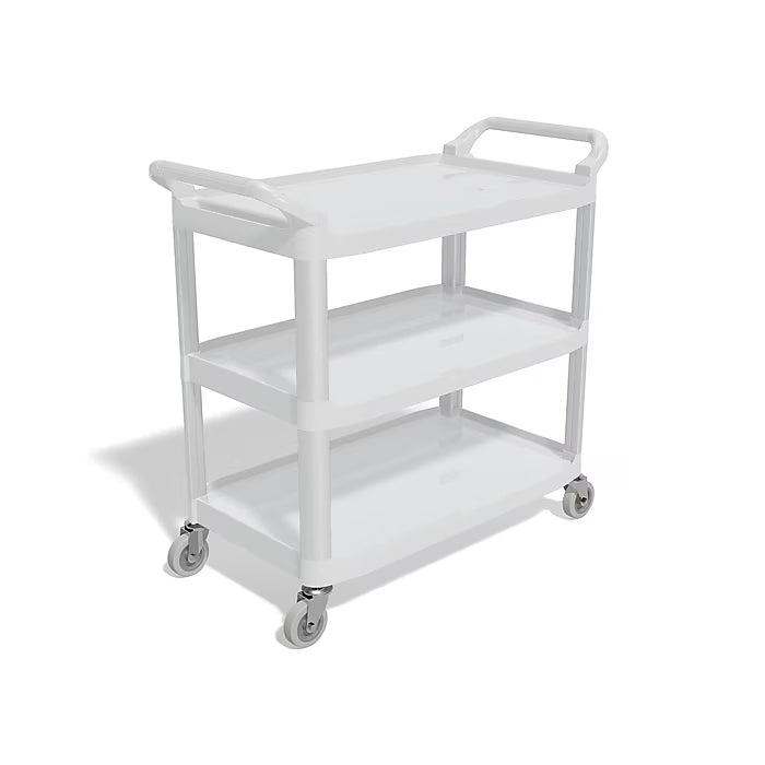 Move tools and supplies throughout the building or office with this gray utility cart. The three shelves let you easily organize and store items, while the plastic construction stands up to long-term use. An open design allows easy access to the contents inside. This Staples utility cart features three wheels and swivel casters for hassle-free mobility and withstands up to a 300-pound weight capacity to keep up with heavy supplies.