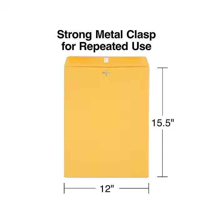 When it has to get there, send it in Staples 28-pound kraft paper envelopes. Staples clasp envelopes are great for your home or business and these sturdy brown kraft clasp envelopes keep papers and cards from bunching or creasing in the mail or in postage meters. These 12-inch x 15-1/2- inch clasp envelopes easily accommodate contracts, proposals and other large documents and the clasps mean you can use them to store files. Every office needs clasp envelopes for document mailing and Staples clasp envelopes are guaranteed by the name you trust for office supplies.