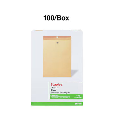 Protect documents with this 100-pack of Staples 10 x 13-inch clasp closure kraft envelopes.