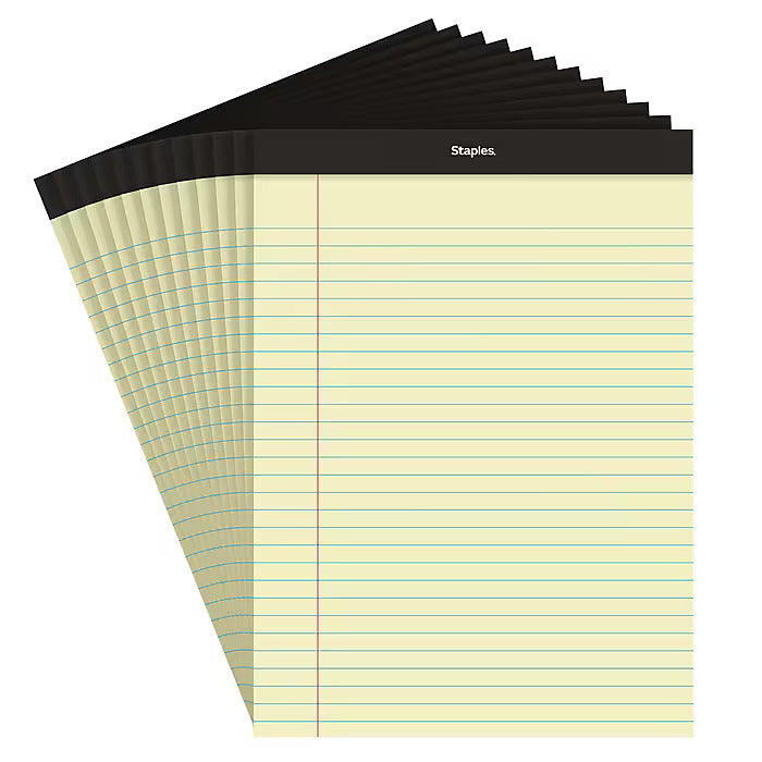 Staples Notepads, 8.5" x 11.75", Wide Ruled, Canary, 50 Sheets/Pad, Dozen