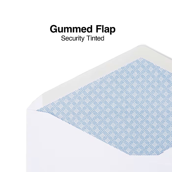 Staples gummed security tint #10 4-1/8 x 9-1/2-inch white envelopes boast a plain white design, making it easy to customize each envelope with mailing labels.